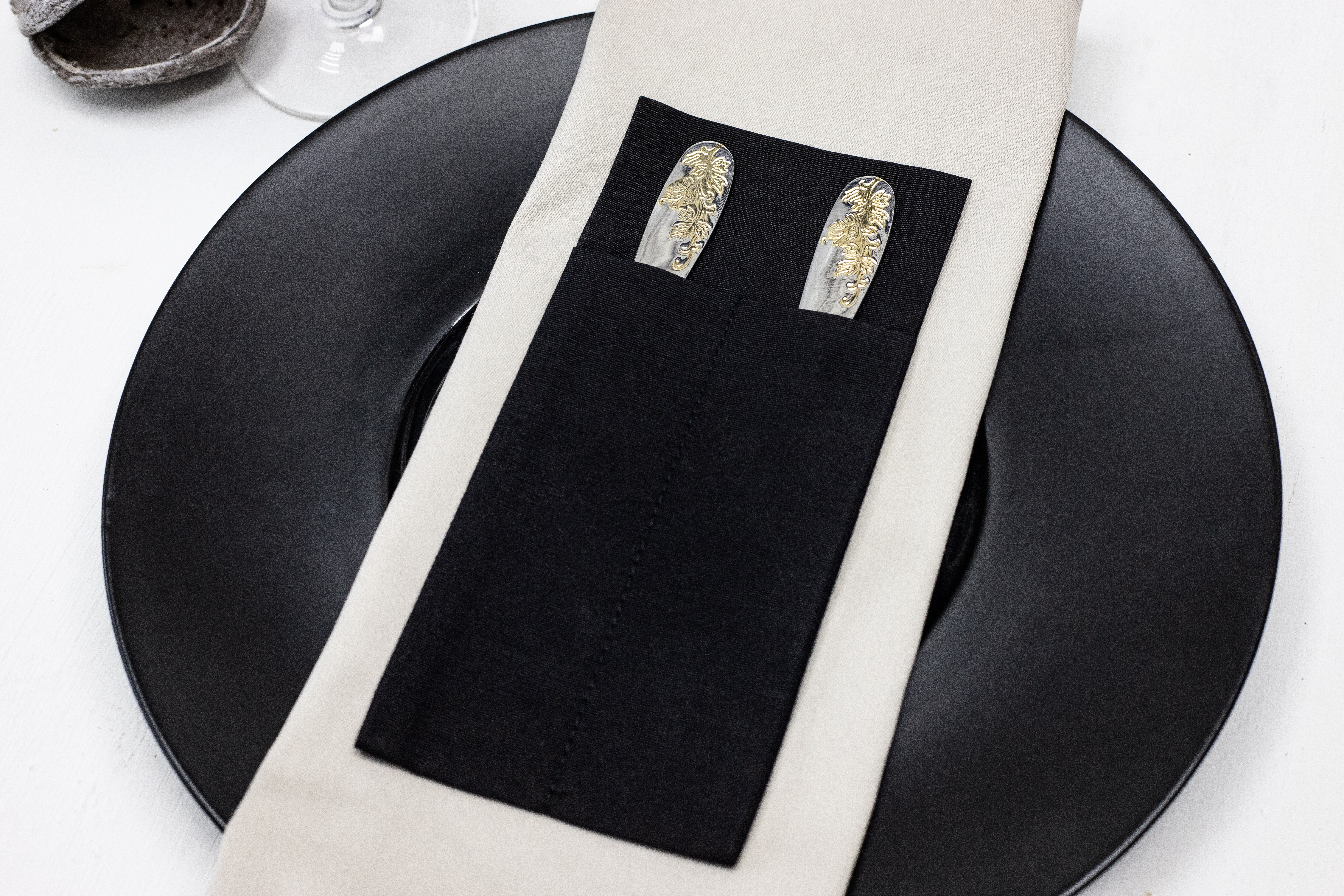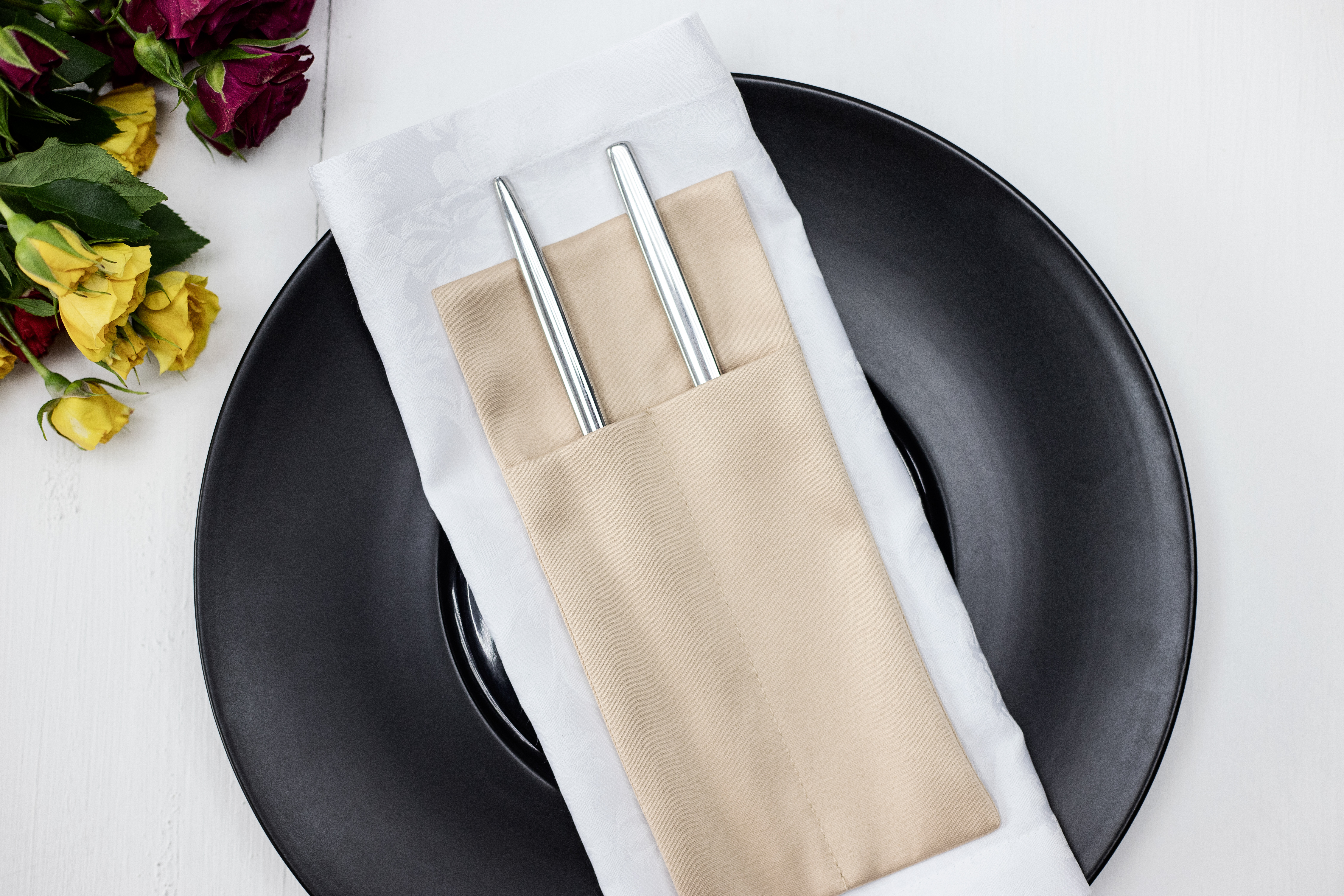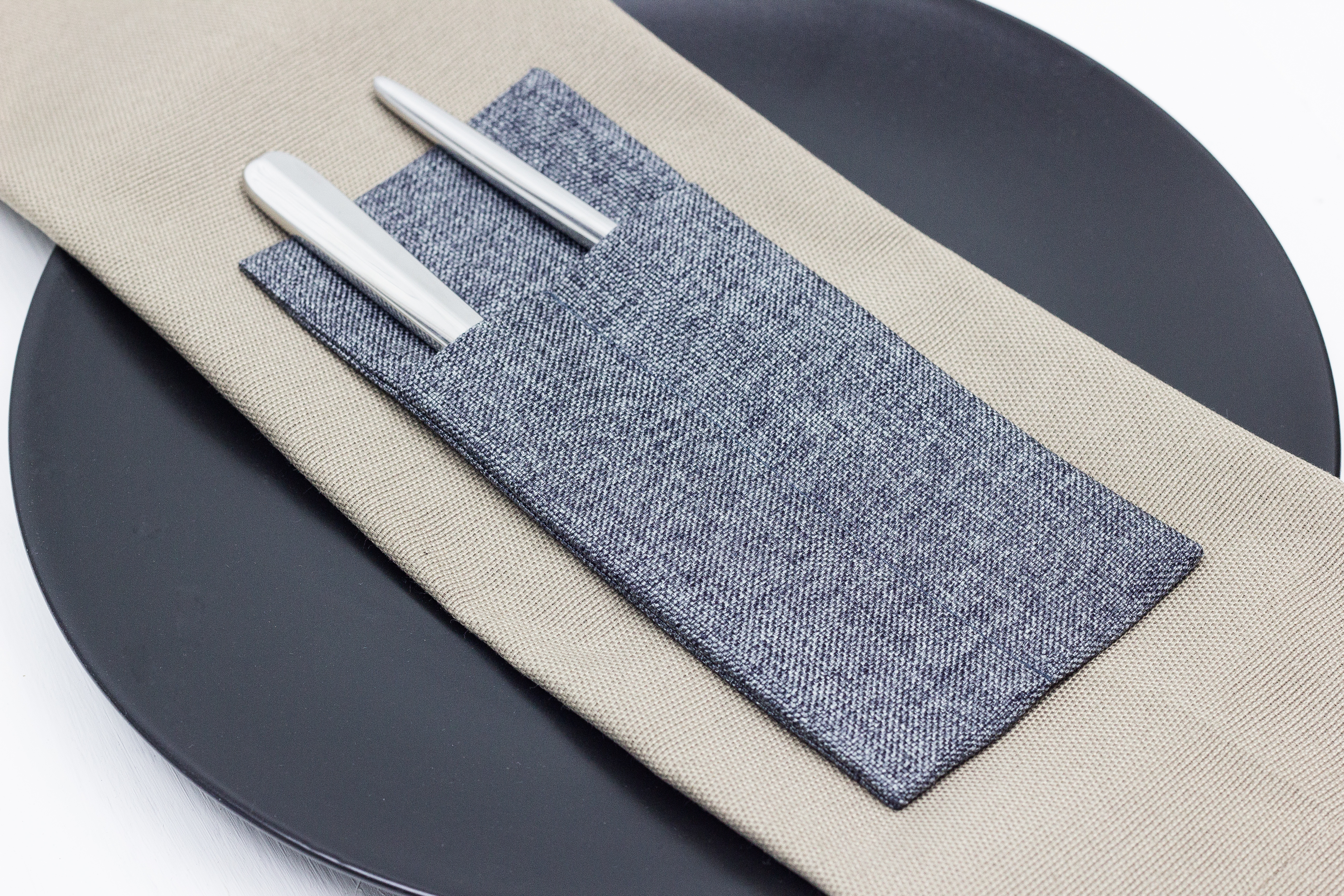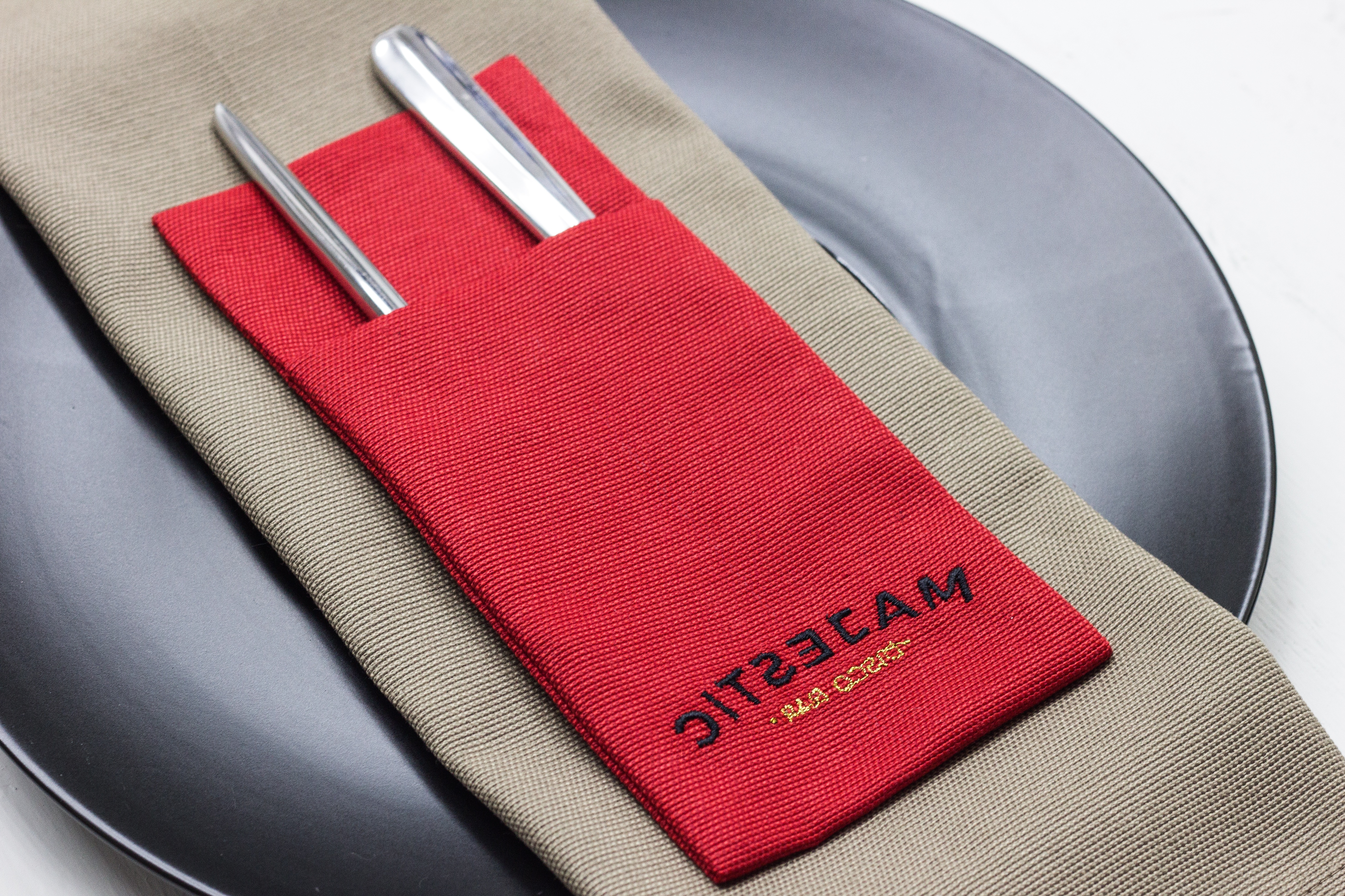 Можно изготовить из любой ткани, добавить необходимое количество карманов и подобрать размер под диаметр ваших тарелок. Вышивку возможно нанести на любом месте.